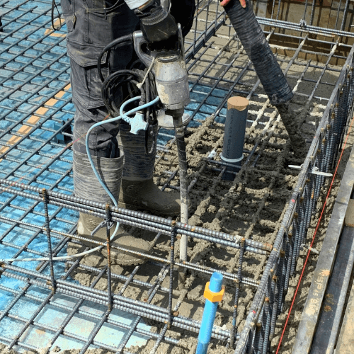 鉄筋工事と連携し、型枠の位置や固定状況を確認後、コンクリートを打設します。均一な締固めで、強固な躯体を形成します。